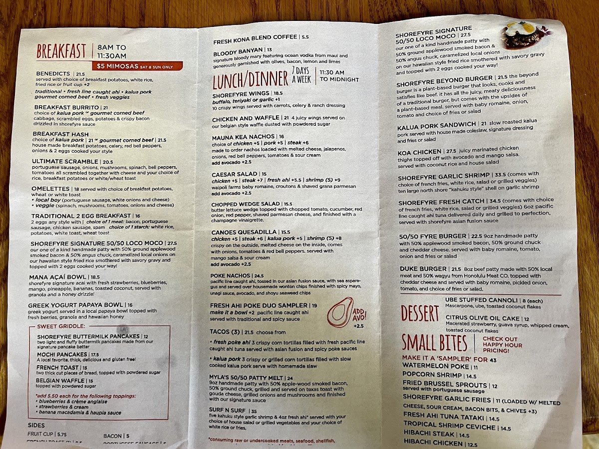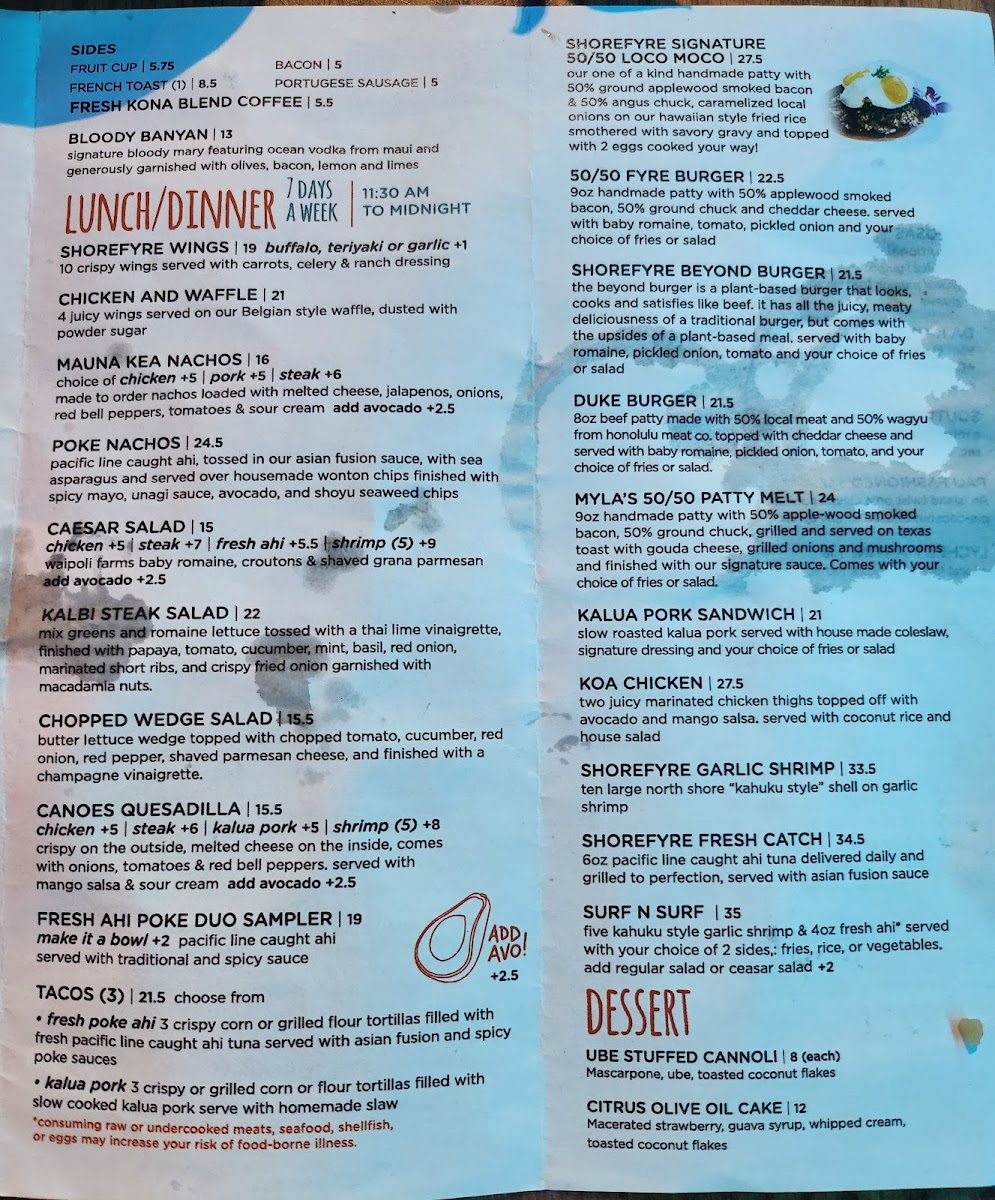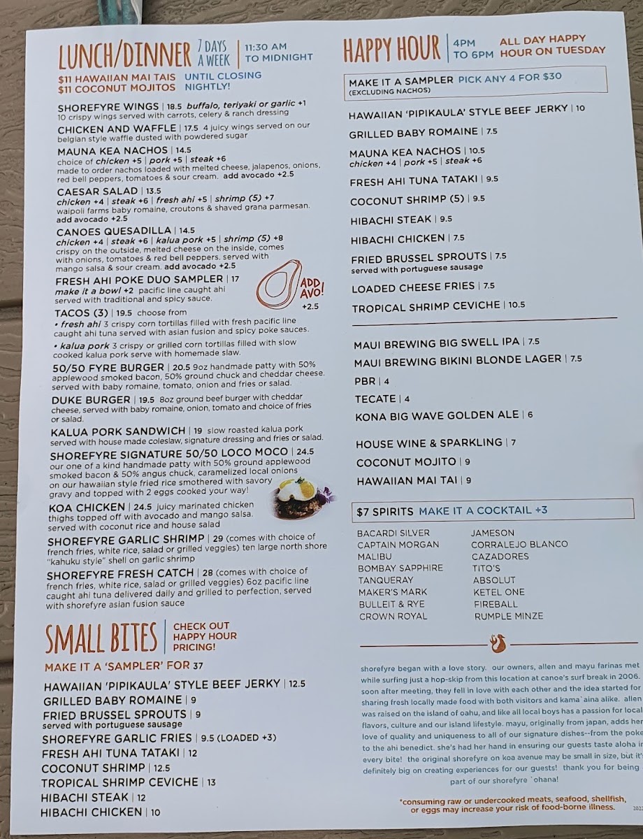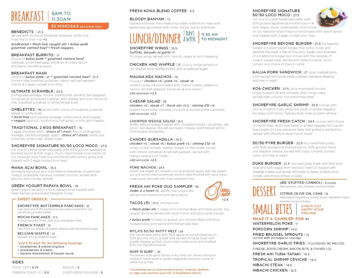 Welcome to Shorefyre Beach Bar Grill, a culinary gem nestled in the heart of Honolulu. Here, the menu is a vibrant celebration of fresh, locally sourced ingredients that harmonize perfectly with the cheerful beach atmosphere. Dive into our tantalizing Happy Hour offerings, featuring dishes like MAUNA KEA Nachos and FRESH AHI Tuna Tataki, each crafted to delight your palate without breaking the bank.